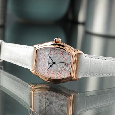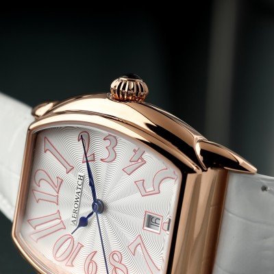 Este relógio Aerowatch tem uma caixa de Inox com um diâmetro de 35 mm e está equipado com uma bracelete de couro. A caixa possui um movimento Ronda e o relógio tem um vidro Safira.