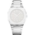 Esta bracelete de relógio Alpina é feita de metal e está fixada ao relógio através de pinos de pressão. A bracelete tem uma largura de 21 mm e fecha através de fivela butterfly com botões de pressão. A bracelete não tem uma montagem a direito, o que significa que esta bracelete só é adequada para os relógios listados abaixo.