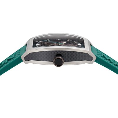 Este relógio Aston Martin tem uma caixa de Titânio com um diâmetro de 41 mm e está equipado com uma bracelete de borracha. A caixa possui um movimento Timex e o relógio tem um vidro Mineral.