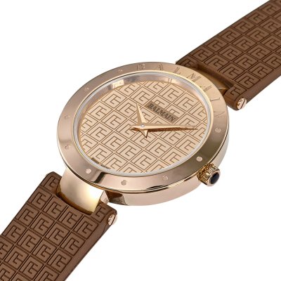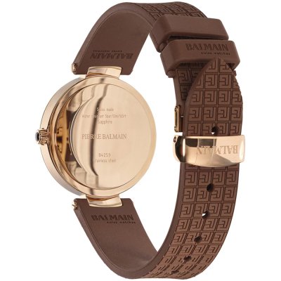 Este relógio Balmain tem uma caixa de Inox com um diâmetro de 33 mm e está equipado com uma bracelete de borracha. A caixa possui um movimento ETA e o relógio tem um vidro Safira.