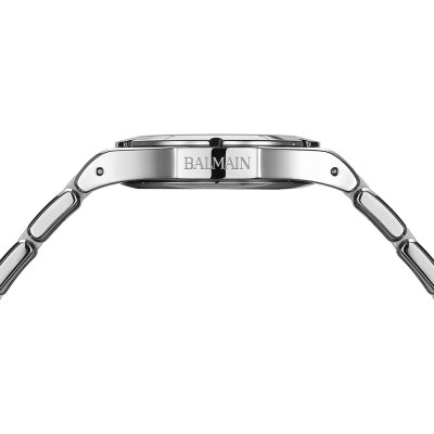 Este relógio Balmain tem uma caixa de Inox com um diâmetro de 33 mm e está equipado com uma bracelete de Inox. A caixa possui um movimento ETA e o relógio tem um vidro Safira.