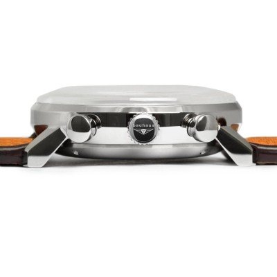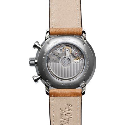 Este cronógrafo automático de estilo aviador, modernista mas clássico, combina o design aerodinâmico da Bauhaus com pormenores subtis. Por exemplo, os pequenos pontos delineados de lúmen às 3, 6 e 9 horas e o triângulo e o ponto duplo às 12 horas, num estilo clássico de aviador. Os ponteiros em tom de ouro rosa contrastam com o mostrador branco, no qual os submostradores são subtilmente recortados. O relógio é alimentado por um movimento suíço Sellita SW500 de 25 jóias com 48 horas de reserva de marcha.