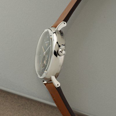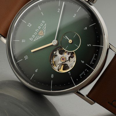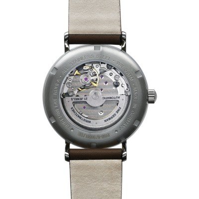 Este relógio Bauhaus tem uma caixa de Inox com um diâmetro de 41 mm e está equipado com uma bracelete de couro. A caixa possui um movimento Miyota e o relógio tem um vidro K1 Mineral.