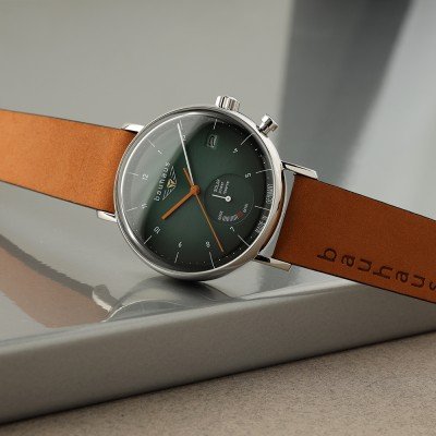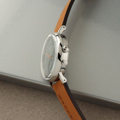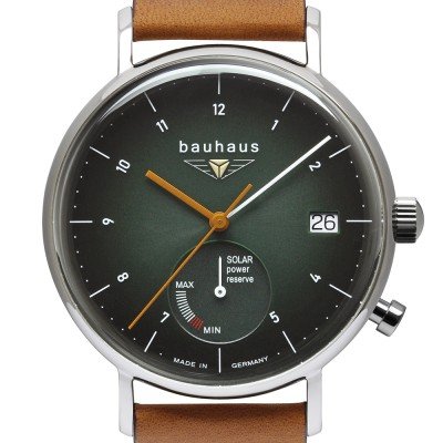Este relógio Bauhaus tem uma caixa de Inox com um diâmetro de 41 mm e está equipado com uma bracelete de couro. A caixa possui um movimento Seiko e o relógio tem um vidro K1 Mineral.