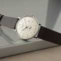 Este relógio Bauhaus tem uma caixa de Inox com um diâmetro de 41 mm e está equipado com uma bracelete de couro. A caixa possui um movimento Ronda e o relógio tem um vidro K1 Mineral.