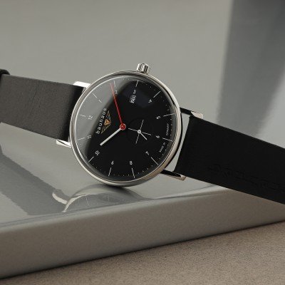 Este relógio Bauhaus tem uma caixa de Inox com um diâmetro de 41 mm e está equipado com uma bracelete de couro. A caixa possui um movimento Ronda e o relógio tem um vidro K1 Mineral.