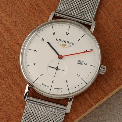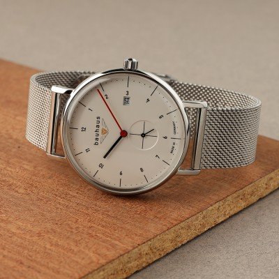 Este relógio Bauhaus tem uma caixa de Inox com um diâmetro de 41 mm e está equipado com uma bracelete de Inox. A caixa possui um movimento Ronda e o relógio tem um vidro K1 Mineral.