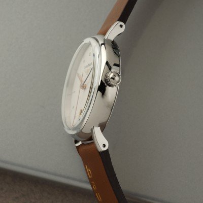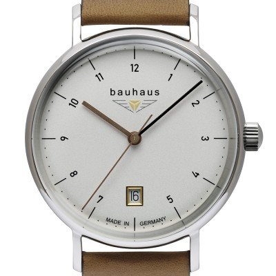Este relógio Bauhaus tem uma caixa de Inox com um diâmetro de 36 mm e está equipado com uma bracelete de couro. A caixa possui um movimento Ronda e o relógio tem um vidro K1 Mineral.