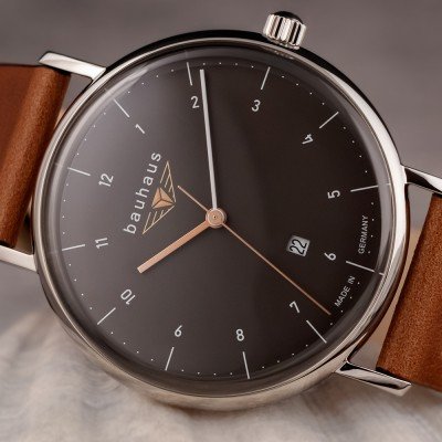 Este relógio Bauhaus tem uma caixa de Inox com um diâmetro de 41 mm e está equipado com uma bracelete de couro. A caixa possui um movimento Ronda e o relógio tem um vidro K1 Mineral.