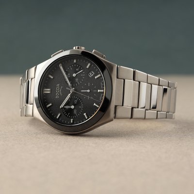 Este relógio Boccia tem uma caixa de Titânio com um diâmetro de 39 mm e está equipado com uma bracelete de Titânio. A caixa possui um movimento Miyota e o relógio tem um vidro Safira.