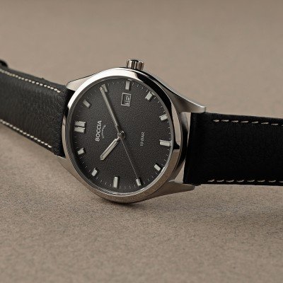 Este relógio Boccia tem uma caixa de Titânio com um diâmetro de 39 mm e está equipado com uma bracelete de couro. A caixa possui um movimento Miyota e o relógio tem um vidro Mineral.