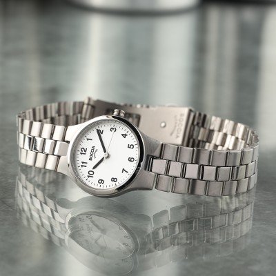 Este relógio Boccia tem uma caixa de Titânio com um diâmetro de 25 mm e está equipado com uma bracelete de Titânio. A caixa possui um movimento Seiko Instruments Inc. e o relógio tem um vidro Mineral.