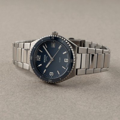 Este relógio Boccia tem uma caixa de Titânio com um diâmetro de 36 mm e está equipado com uma bracelete de Titânio. A caixa possui um movimento Miyota e o relógio tem um vidro Safira.