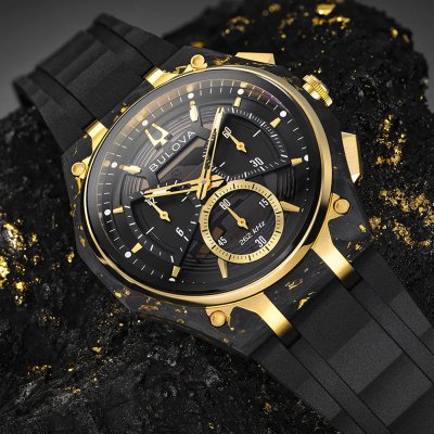 O Bulova Curv é uma maravilha da engenharia técnica com um design ergonómico elegante e uma caixa fina nunca antes possível num relógio cronógrafo. A Bulova altera as regras com o primeiro movimento de cronógrafo curvo do mundo. Todos os relógios Curv são alimentados por um movimento de quartzo de alta precisão patenteado com uma frequência de 262 kHz que oferece uma precisão extraordinária. Conheça o nosso Curv 2025. O novo design e os novos materiais inovadores convergem para criar esta impressionante caixa. O carbono forjado é combinado com uma folha de ouro com 97,97% de ouro puro para alojar o nosso movimento Curv. A estrutura da caixa realça o novo design do mostrador e é melhorada com uma bracelete de borracha HNBR premium e uma fivela dobrável para um ajuste confortável ao pulso.