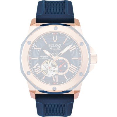 Esta bracelete de relógio Bulova é feita de borracha e está fixada ao relógio através de pinos de pressão. A bracelete tem uma largura de 24 mm e fecha através de fecho. A bracelete tem uma montagem a direito, o que significa que esta bracelete é adequada para todos os relógios Bulova com montagem da bracelete a direito.