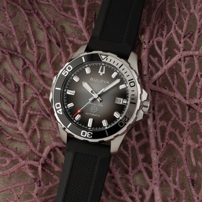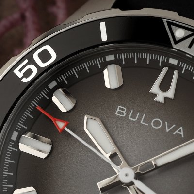 Este relógio Bulova tem uma caixa de Inox com um diâmetro de 41 mm e está equipado com uma bracelete de borracha. A caixa possui um movimento Miyota e o relógio tem um vidro Safira.