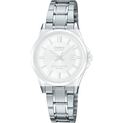 Esta bracelete de relógio Casio é feita de aço inoxidável e está fixada ao relógio através de pinos de pressão. A bracelete tem uma largura de 14 mm e fecha através de fivela dobrável com botões de pressão. A bracelete não tem uma montagem a direito, o que significa que esta bracelete só é adequada para os relógios listados abaixo.