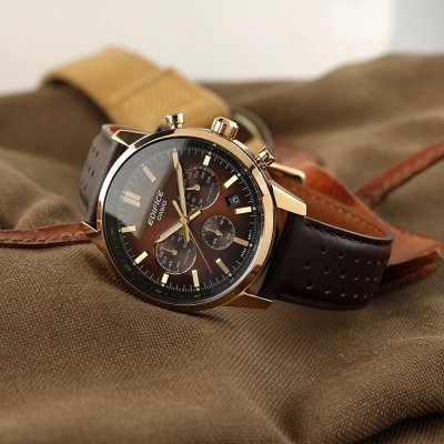 Este relógio Casio Edifice tem uma caixa de Inox com um diâmetro de 41 mm e está equipado com uma bracelete de couro. A caixa possui um movimento Casio e o relógio tem um vidro Mineral.