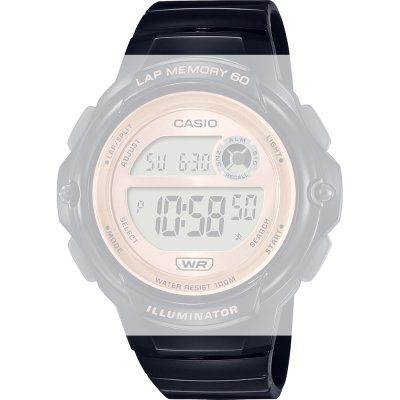 Esta bracelete de relógio Casio é feita de resina e está fixada ao relógio através de pinos de pressão. A bracelete tem uma largura de 18 mm e fecha através de fecho. A bracelete não tem uma montagem a direito, o que significa que esta bracelete só é adequada para os relógios listados abaixo.