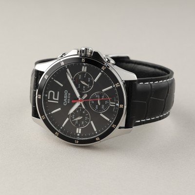 Este relógio Casio tem uma caixa de Liga de Metal com um diâmetro de 43.6 mm e está equipado com uma bracelete de couro. A caixa possui um movimento Casio e o relógio tem um vidro Mineral.