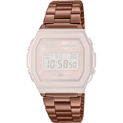 Esta bracelete de relógio Casio é feita de aço inoxidável e está fixada ao relógio através de pinos carregados por mola de liberação rápida. A bracelete tem uma largura de 21 mm e fecha através de fivela dobrável com botões de pressão. A bracelete não tem uma montagem a direito, o que significa que esta bracelete só é adequada para os relógios listados abaixo.