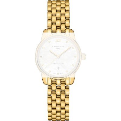 Esta bracelete de relógio Certina é feita de aço inoxidável e está fixada ao relógio através de pinos de pressão. A bracelete tem uma largura de 13 mm e fecha através de fivela butterfly com botões de pressão. A bracelete não tem uma montagem a direito, o que significa que esta bracelete só é adequada para os relógios listados abaixo.