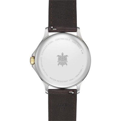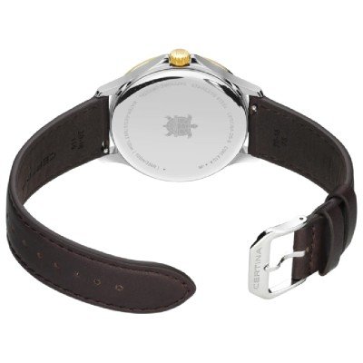 Este relógio Certina tem uma caixa de Inox com um diâmetro de 40 mm e está equipado com uma bracelete de couro. A caixa possui um movimento ETA e o relógio tem um vidro Safira anti-reflexo única.
