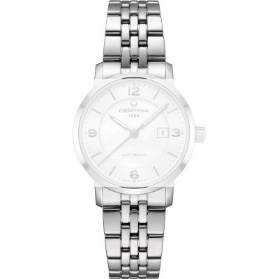 Esta bracelete de relógio Certina é feita de aço inoxidável e está fixada ao relógio através de pinos de pressão. A bracelete tem uma largura de 15 mm e fecha através de fivela butterfly com botões de pressão. A bracelete não tem uma montagem a direito, o que significa que esta bracelete só é adequada para os relógios listados abaixo.