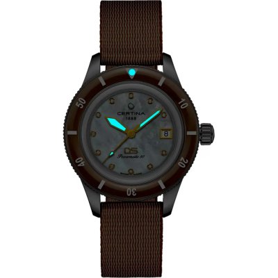 Os relógios DS PH são inspirados nos lendários relógios de mergulho Certina dos anos 1960. O relógio possui um movimento Powermatic 80 com uma notável reserva de marcha de 80 horas. Esta versão de 39 mm irá agradar às mulheres desportivas com a sua elegante e suave bracelete com cinto de segurança e mostrador em madrepérola com 11 índices de diamantes rodeados por uma luneta em cerâmica branca. Concebido para mulheres que procuram um relógio simultaneamente elegante e robusto, este relógio destaca-se pelo seu design meticuloso e tecnologia comprovada.
