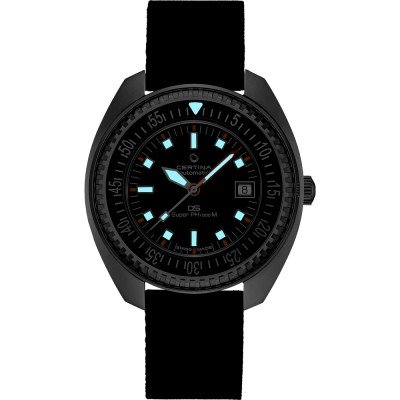 Este relógio Certina tem uma caixa de Inox com um diâmetro de 43.5 mm e está equipado com uma bracelete de Tecido. A caixa possui um movimento ETA e o relógio tem um vidro Safira anti-reflexo única.