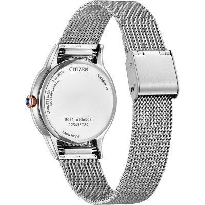 Este relógio Citizen tem uma caixa de Inox com um diâmetro de 32 mm e está equipado com uma bracelete de Inox. A caixa possui um movimento Citizen e o relógio tem um vidro Safira.