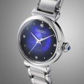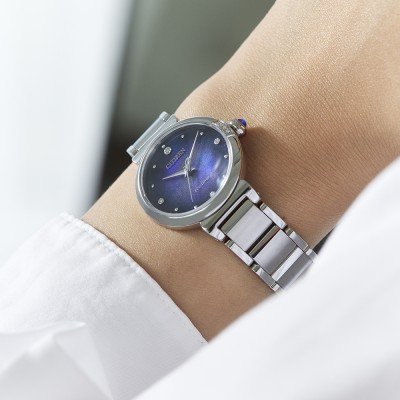 Este belo relógio de mulher Citizen L é inspirado na beleza do mar calmo e azul. Quatro diamantes genuínos no mostrador representam a superfície cintilante do mar, com bolhas de ar a surgirem das profundezas. O relógio faz parte da coleção exclusiva Unite in blue e foi limitado a 2000 peças em todo o mundo. O movimento solar Cal. E031 Eco-Drive tem uma precisão de ±15 segundos por mês e funciona durante 6 meses com uma carga completa. O relógio é resistente à água até 5 atm. Para além de preciso e fiável, este relógio de mulher amigo do ambiente tem estilo e é elegante. Um vidro de safira abaulado, uma coroa de cabochão azul e cristais na caixa dão um toque adicional de luxo.