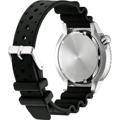Este relógio Citizen tem uma caixa de Inox com um diâmetro de 44 mm e está equipado com uma bracelete de borracha. A caixa possui um movimento Citizen e o relógio tem um vidro Mineral.