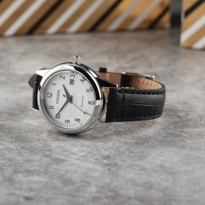 Este relógio Citizen tem uma caixa de Inox com um diâmetro de 29.3 mm e está equipado com uma bracelete de couro. A caixa possui um movimento Citizen e o relógio tem um vidro Safira.