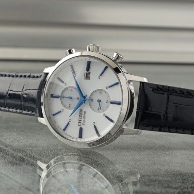 Este relógio Citizen tem uma caixa de Inox com um diâmetro de 42 mm e está equipado com uma bracelete de couro. A caixa possui um movimento Citizen e o relógio tem um vidro Mineral.