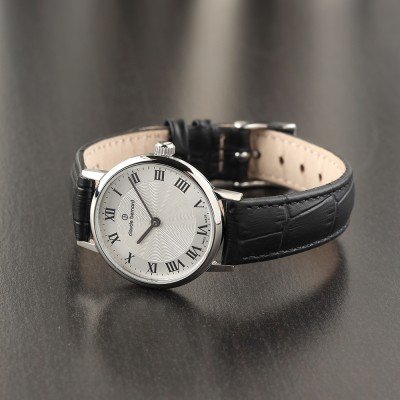 Este relógio Claude Bernard tem uma caixa de Inox com um diâmetro de 27 mm e está equipado com uma bracelete de couro. A caixa possui um movimento Ronda e o relógio tem um vidro Safira.