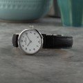 Este relógio Claude Bernard tem uma caixa de Inox com um diâmetro de 27 mm e está equipado com uma bracelete de couro. A caixa possui um movimento Ronda e o relógio tem um vidro Safira.