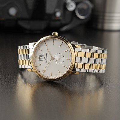 Este relógio Claude Bernard tem uma caixa de Inox com um diâmetro de 39 mm e está equipado com uma bracelete de Inox. A caixa possui um movimento Ronda e o relógio tem um vidro Safira.