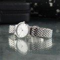 Este relógio Claude Bernard tem uma caixa de Inox com um diâmetro de 27 mm e está equipado com uma bracelete de Inox. A caixa possui um movimento Ronda e o relógio tem um vidro Mineral.