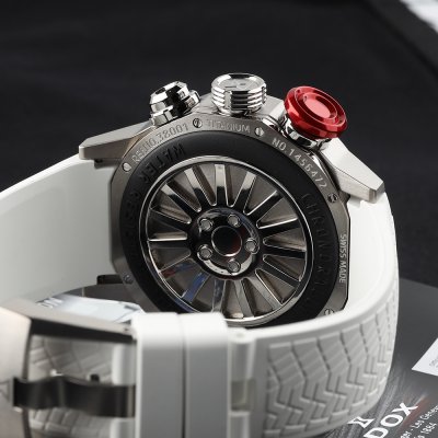 Este relógio Edox tem uma caixa de Titânio com um diâmetro de 48 mm e está equipado com uma bracelete de borracha. A caixa possui um movimento Ronda e o relógio tem um vidro Safira.