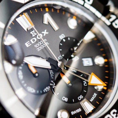 Este relógio de mergulho Edox é um verdadeiro clássico. A luneta giratória que permite medir intervalos de tempo de até 60 minutos, confere ao relógio o seu clássico caráter Edox, juntamente com os três ponteiros do cronógrafo. A caixa é selada por meio de uma tampa aparafusada. A coroa também é aparafusada, garantindo um alto grau de resistência à água. Os índices e ponteiros são cobertos com um revestimento Super-LumiNova tornando o relógio facilmente legível mesmo em locais escuros. Além disso, o relógio tem uma válvula de hélio. Isso protege contra sobrepressão, de modo a que o relógio possa ser usado sob alta pressão, por exemplo, quando usado debaixo de água por muito tempo.