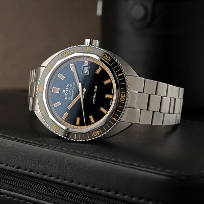 Este Edox Hydro-Sub é uma edição especial limitada a apenas 500 exemplares. É resistente à água até 30 ATM e alimentado por um movimento automático Edox Calibre 806, baseado no Sellita SW200 e certificado pelo COSC. O seu design clássico é realçado pela subtil luneta em cerâmica inserida e pelos ponteiros e índices luminosos proeminentes.