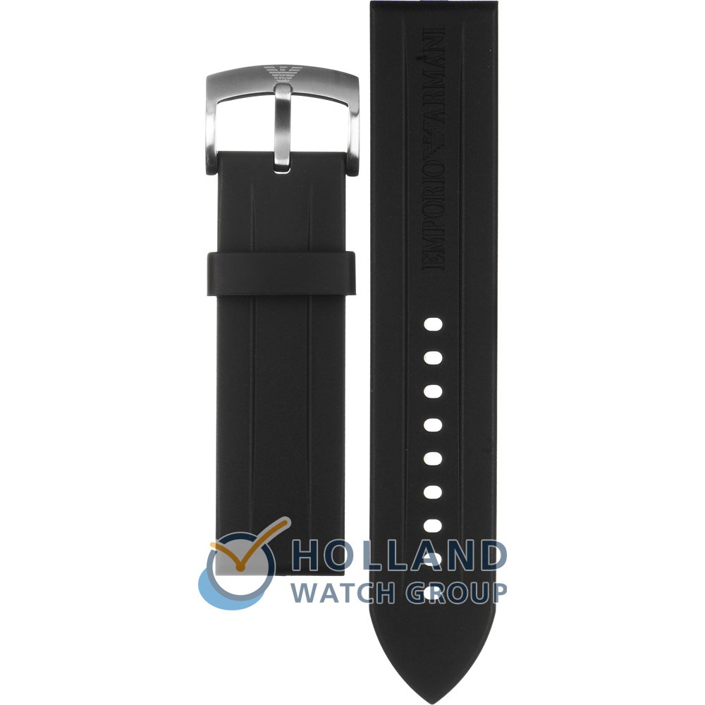Esta bracelete de relógio Emporio Armani é feita de silicone e está fixada ao relógio através de pinos de pressão. A bracelete tem uma largura de 23 mm e fecha através de fecho. A bracelete tem uma montagem a direito, o que significa que esta bracelete é adequada para todos os relógios Emporio Armani com montagem da bracelete a direito.
