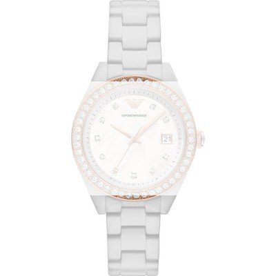 Esta bracelete de relógio Emporio Armani é feita de cerâmica e está fixada ao relógio através de pino e tubo. A bracelete tem uma largura de 16 mm e fecha através de fivela butterfly com botões de pressão. A bracelete não tem uma montagem a direito, o que significa que esta bracelete só é adequada para os relógios listados abaixo.