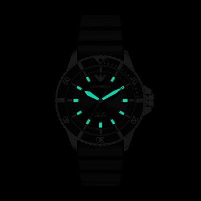 Este relógio Emporio Armani tem uma caixa de Inox com um diâmetro de 42 mm e está equipado com uma bracelete de borracha. A caixa possui um movimento Miyota e o relógio tem um vidro Mineral.