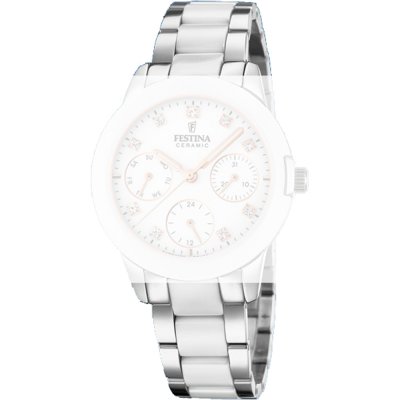 Esta bracelete de relógio Festina é feita de aço inoxidável e está fixada ao relógio através de pinos de pressão. A bracelete tem uma largura de 17 mm e fecha através de fivela dobrável com botões de pressão. A bracelete não tem uma montagem a direito, o que significa que esta bracelete só é adequada para os relógios listados abaixo.