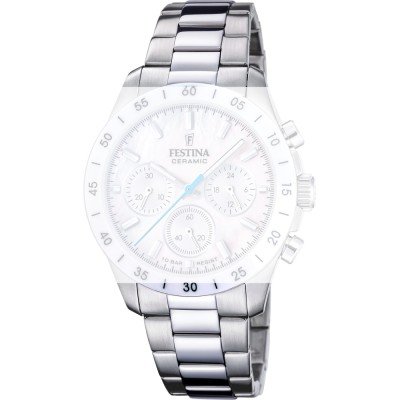 Esta bracelete de relógio Festina é feita de aço inoxidável e está fixada ao relógio através de pinos de pressão. A bracelete tem uma largura de 19 mm e fecha através de fivela dobrável com botões de pressão. A bracelete não tem uma montagem a direito, o que significa que esta bracelete só é adequada para os relógios listados abaixo.
