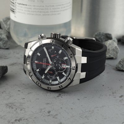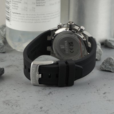 Este relógio Festina tem uma caixa de Inox com um diâmetro de 44.5 mm e está equipado com uma bracelete de borracha. A caixa possui um movimento Miyota e o relógio tem um vidro Mineral.