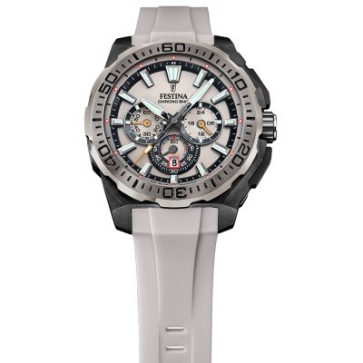 Este relógio Festina tem uma caixa de Inox com um diâmetro de 45.5 mm e está equipado com uma bracelete de borracha. A caixa possui um movimento Miyota e o relógio tem um vidro Mineral.