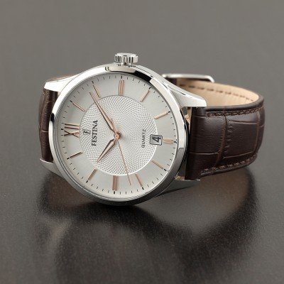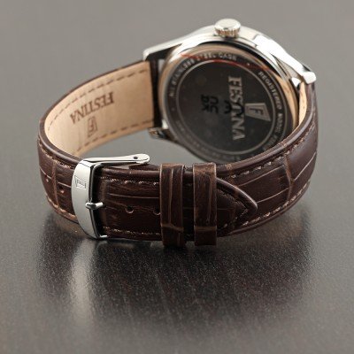 Este relógio Festina tem uma caixa de Inox com um diâmetro de 43 mm e está equipado com uma bracelete de couro. A caixa possui um movimento Miyota e o relógio tem um vidro Mineral.